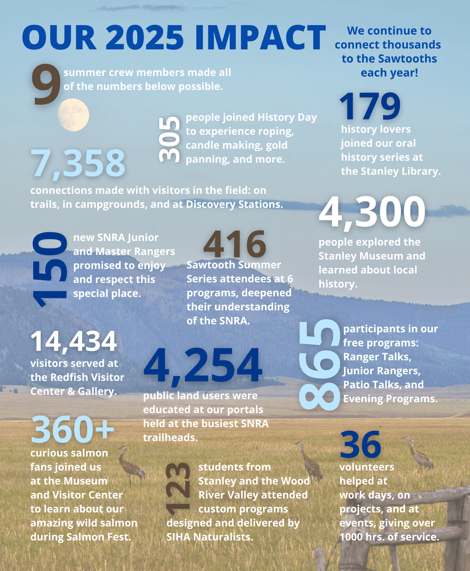 Additionally, SIHA holds two 20-year special use permits. One to manage and operate the Stanley Museum, which has been in place since the 1980s. The other to manage and operate the Redfish Visitor Center & Gallery which has been in place since 2011.